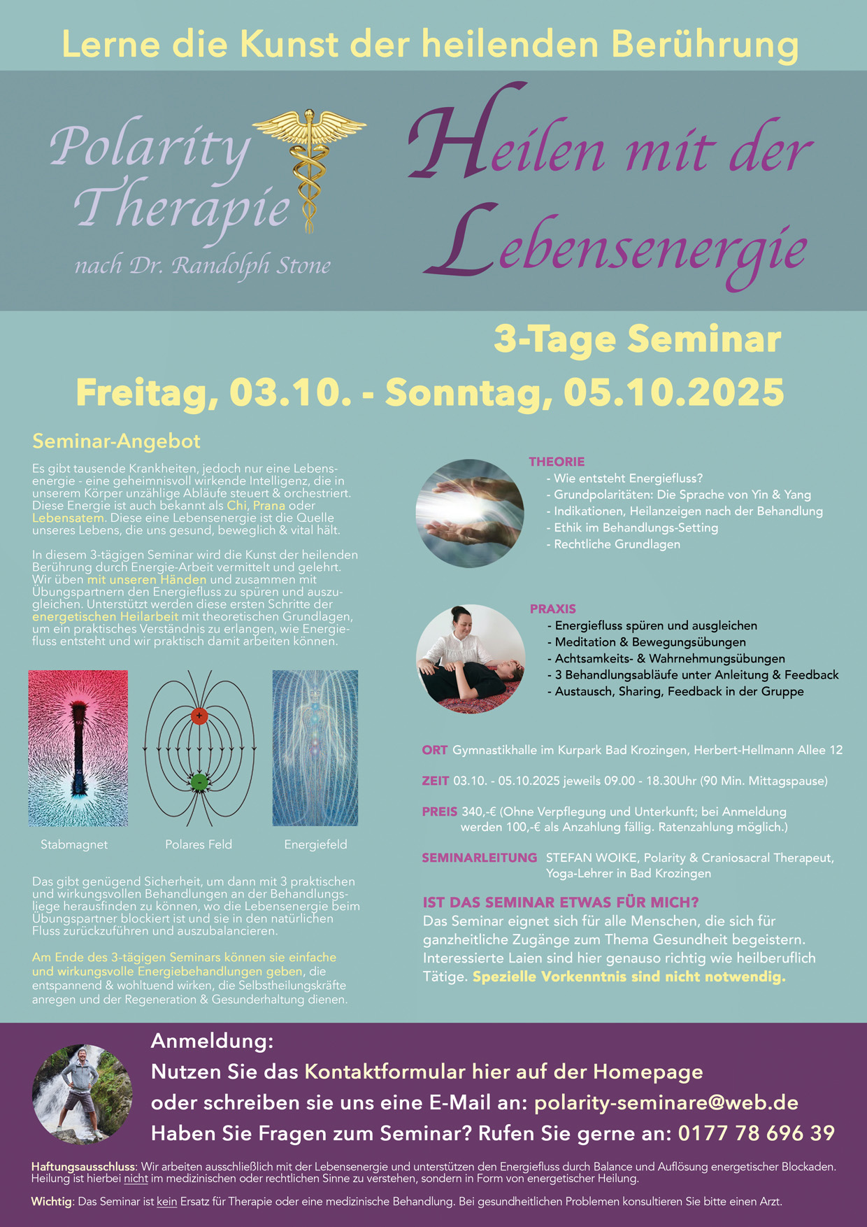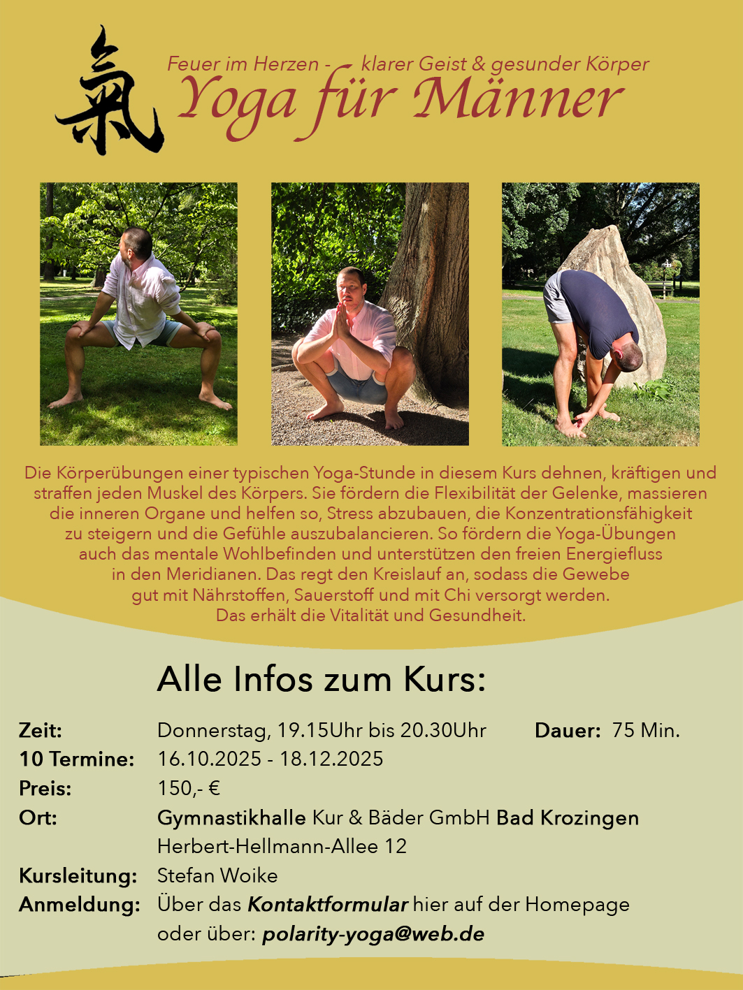 Als Polarity-Yogalehrer ist es mir eine Herzensangelegenheit in unseren Kursen „Hilfe zur Selbsthilfe“ anzubieten. Mir ist es schon immer wichtig gewesen, selbst etwas für meine Gesundheit tun zu können und das auf möglichst einfache und praktische Weise. Hier hat das Polarity Yoga eine ganz besondere Bedeutung für mich, da die Übungen so praxisnah & alltagsorientiert sind, dass man sie überall leicht anwenden kann. Auch in meiner fast 15- jährigen Tätigkeit als Polarity- und Craniosacral-Therapeut in eigener Praxis oder als Fitnesstrainer sind die Übungen fester Bestandteil in meiner täglichen Arbeit. Sie haben mich viel über Körper, Geist und Gesundheit gelehrt, was in unseren Kursen Anwendung findet.