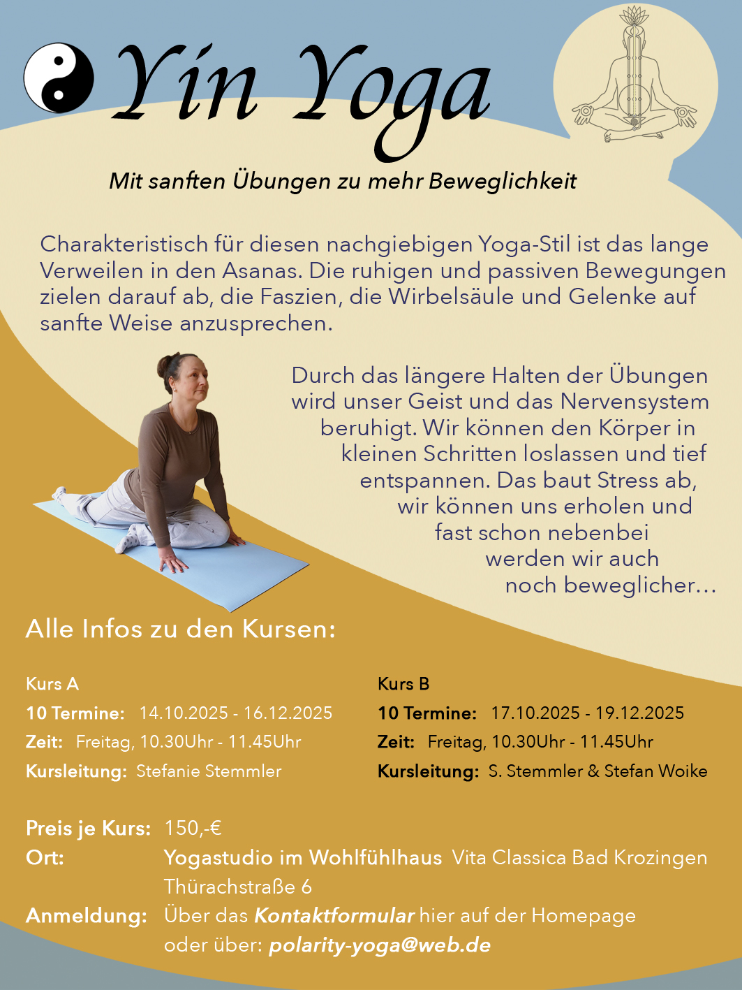 Ich kenne das Gefühl gut, lange nichts für sich getan zu haben und dass aller Anfang schwer ist. Als angehende Polarity-Therapeutin kam ich nicht mehr drum herum, endlich etwas für meinen Körper zu tun. Ich war ganz schön eingerostet. Mit dem Entdecken der Polarity Yoga-Übungen, kam Schritt für Schritt die Beweglichkeit und auch die Bewegungslust zurück in mein Leben. Mittlerweile habe ich eine Ausbildung als Yin-Yoga Trainerin absolviert und es macht mir großen Spaß mit anderen gemeinsam Yoga zu machen und mit meinem Herzen an ihrer Freude teilzuhaben, wenn auch sie Neues für sich entdecken.